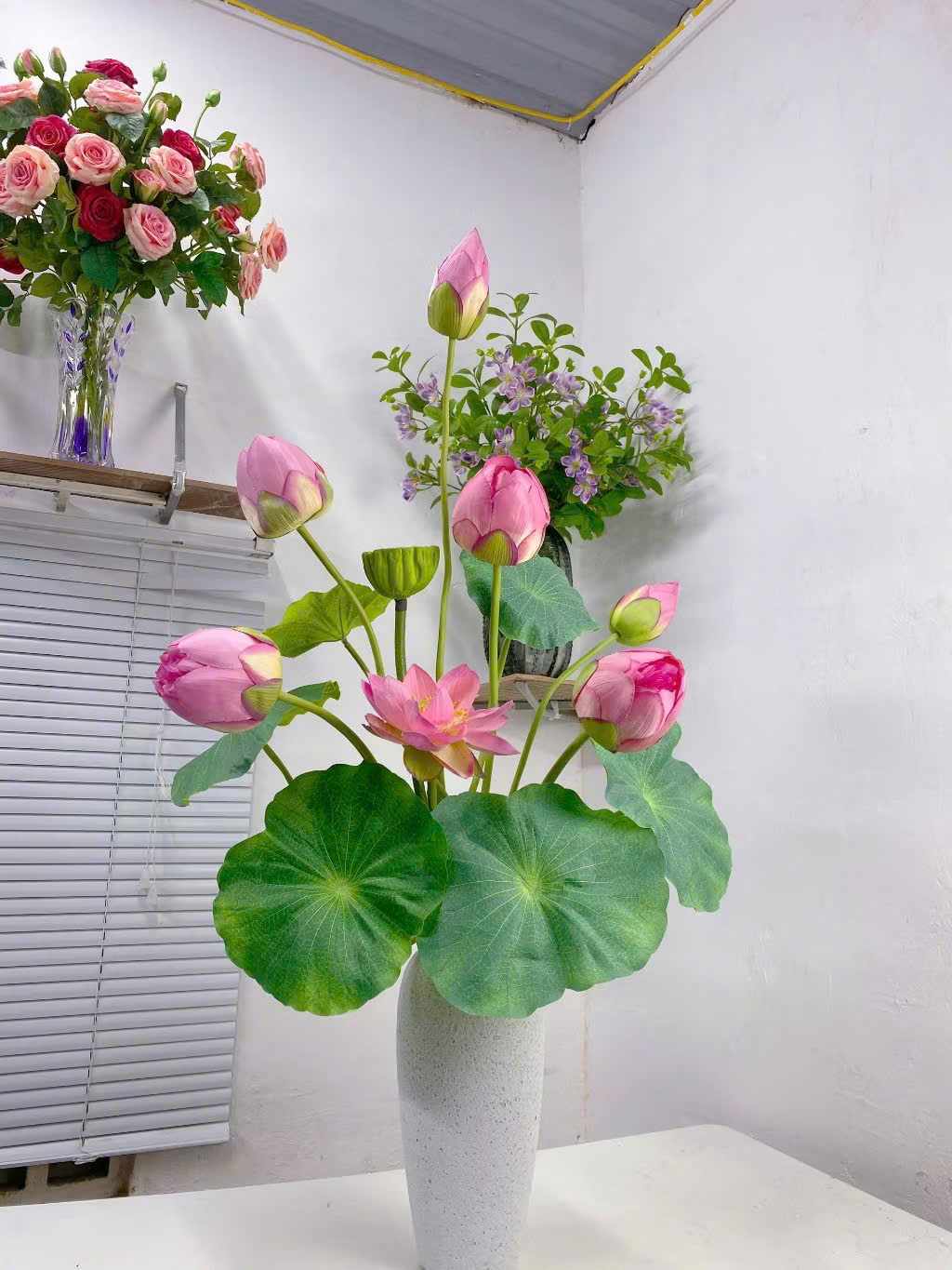 Cụm bông sen mang vẻ đẹp nhẹ nhàng, không quá rực rỡ nhưng đủ để tạo điểm nhấn tinh tế cho không gian. Dáng sen mềm mại giúp tổng thể decor trở nên hài hòa và thư thái.